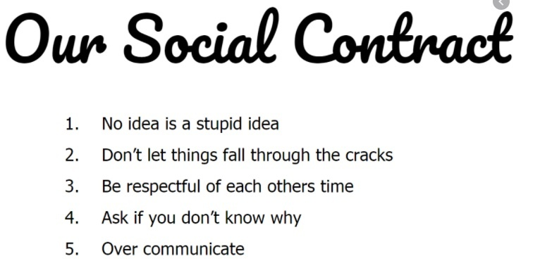 **Social contracts** set the ground rules on what is acceptable or expected behaviour, making it safe for everyone to participate. Essentially the agreement creates the norms of what is expected in the specific context of that team.